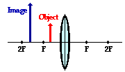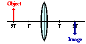 When the object is located at the 2F point, the image will also be located at the 2F point on the other side of the lens. In this case, the image will be inverted (i.e., a right side up object results in an upside-down image). The image dimensions are equal to the object dimensions. A six-foot tall person would have an image that is six feet tall; the absolute value of the magnification is exactly 1. Finally, the image is a real image. Light rays actually converge at the image location. As such, the image of the object could be projected upon a sheet of paper.