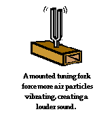 This same principle of a forced vibration is often demonstrated in a Physics classroom using a tuning fork. If the tuning fork is held in your hand and hit with a rubber mallet, a sound is produced as the tines of the tuning fork set surrounding air particles into vibrational motion. The sound produced by the tuning fork is barely audible to students in the back rows of the room. However, if the tuning fork is set upon the whiteboard panel or the glass panel of the overhead projector, the panel begins vibrating at the same natural frequency of the tuning fork. The tuning fork forces surrounding glass (or vinyl) particles into vibrational motion. The vibrating whiteboard or overhead projector panel in turn forces surrounding air particles into vibrational motion and the result is an increase in the amplitude and thus loudness of the sound. This principle of forced vibration explains why demonstration tuning forks are mounted on a sound box, why a commercial music box mechanism is mounted on a sounding board, why a guitar utilizes a sound box, and why a piano string is attached to a sounding board. A louder sound is always produced when an accompanying object of greater surface area is forced into vibration at the same natural frequency.