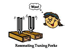 box system having the same natural frequency (say 256 Hz) is placed on the table near the first system. Neither of the tuning forks is vibrating. Suppose the first tuning fork is struck with a rubber mallet and the tines begin vibrating at its natural frequency - 256 Hz. These vibrations set its sound box and the air inside the sound box vibrating at the same natural frequency of 256 Hz. Surrounding air particles are set into vibrational motion at the same natural frequency of 256 Hz and every student in the classroom hears the sound. Then the tines of the tuning fork are grabbed to prevent their vibration and remarkably the sound of 256 Hz is still being heard. Only now the sound is being produced by the second tuning fork - the one which wasn't hit with the mallet. Amazing!! The demonstration is often repeated to assure that the same surprising results are observed. They are! What is happening?