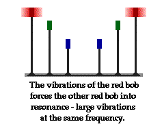 bobs mounted on a very elastic metal pole, which are in turn mounted to a metal bar. Each metal pole and attached bob has a different length, thus giving it a different natural frequency of vibration. The bobs are often color-coded to distinguish between them; they are colored red, blue and green (a set of three colors that will be significant later in The Physics Classroom Tutorial). The red bobs are mounted on the longer poles and they have the lowest natural frequency of vibration. The blue bobs are mounted on the shorter poles and have the highest natural frequency of vibration. (Note the length-wavelength-frequency relationship that was discussed earlier.) When the red bob is disturbed, it begins vibrating at its natural frequency. This in turn forces the attached bar to vibrate at the same frequency; and this forces the other attached red bob into vibrating at the same natural frequency. This is resonance - one bob vibrating at a given frequency forcing a second object with the same natural frequency into vibrational motion. While the green and the blue bobs were disturbed by the vibrations transmitted through the metal bar, only the red bob would resonate. This is because the frequency of the first red bob is tuned to the frequency of the second red bob; they share the same natural frequency. The result is that the second red bob begins vibrating with a huge amplitude.