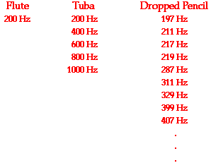 All objects have a natural frequency or set of frequencies at which they vibrate. The quality or timbre of the sound produced by a vibrating object is dependent upon the natural frequencies of the sound waves produced by the objects. Some objects tend to vibrate at a single frequency and they are often said to produce a pure tone. A flute tends to vibrate at a single frequency, producing a very pure tone. Other objects vibrate and produce more complex waves with a set of frequencies that have a whole number mathematical relationship between them; these are said to produce a rich sound. A tuba tends to vibrate at a set of frequencies that are mathematically related by whole number ratios; it produces a rich tone. Still other objects will vibrate at a set of multiple frequencies that have no simple mathematical relationship between them. These objects are not musical at all and the sounds that they create could be described as noise. When a meter stick or pencil is dropped on the floor, it vibrates with a number of frequencies, producing a complex sound wave that is clanky and noisy.