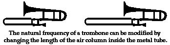 As another example, consider the trombone with its long cylindrical tube that is bent upon itself twice and ends in a flared end. The trombone is an example of a wind instrument. The tube of any wind instrument acts as a container for a vibrating air column. The air inside the tube will be set into vibration by a vibrating reed or the vibrations of a musician's lips against a mouthpiece. While the speed of sound waves within the air column is not alterable by the musician (they can only be altered by changes in room temperature), the length of the air column is. For a trombone, the length is altered by pushing the tube outward away from the mouthpiece to lengthen it or pulling it in to shorten it. This causes the length of the air column to be changed, and subsequently changes the wavelength of the waves it produces. And of course, a change in wavelength will result in a change in the frequency. So the natural frequency of a wind instrument such as the trombone is dependent upon the length of the air column of the instrument. The same principles can be applied to any similar instrument (tuba, flute, wind chime, organ pipe, clarinet, or pop bottle) whose sound is produced by vibrations of air within a tube.