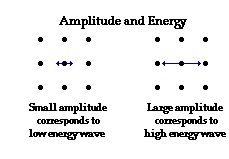 Sound waves are introduced into a medium by the vibration of an object. For example, a vibrating guitar string forces surrounding air molecules to be compressed and expanded, creating a pressure disturbance consisting of an alternating pattern of compressions and rarefactions. The disturbance then travels from particle to particle through the medium, transporting energy as it moves. The energy that is carried by the disturbance was originally imparted to the medium by the vibrating string. The amount of energy that is transferred to the medium is dependent upon the amplitude of vibrations of the guitar string. If more energy is put into the plucking of the string (that is, more work is done to displace the string a greater amount from its rest position), then the string vibrates with a greater amplitude. The greater amplitude of vibration of the guitar string thus imparts more energy to the medium, causing air particles to be displaced a greater distance from their rest position. Subsequently, the amplitude of vibration of the particles of the medium is increased, corresponding to an increased amount of energy being carried by the particles. This relationship between energy and amplitude was discussed in more detail in a previous unit.
