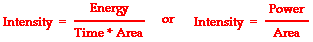 The amount of energy that is transported past a given area of the medium per unit of time is known as the intensity of the sound wave. The greater the amplitude of vibrations of the particles of the medium, the greater the rate at which energy is transported through it, and the more intense that the sound wave is. Intensity is the energy/time/area; and since the energy/time ratio is equivalent to the quantity power, intensity is simply the power/area.