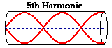 The next highest frequency above the third harmonic is the fifth harmonic. It is the standing wave pattern with the next smallest wavelength. The standing wave pattern for the fifth harmonic of a closed-end air column is produced by adding another node to the pattern. This would result in a total of three anti-nodes and three nodes. This pattern is shown in the diagram below. Observe in the pattern that there are one and one-fourth waves present in the length of the air column. That is five times the number of waves in the first harmonic. For this reason, the frequency of the fifth harmonic is five times the frequency of the first harmonic.