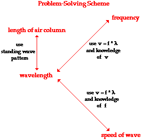 Now the aim of the above discussion is to internalize the mathematical relationships for closed-end air columns in order to perform calculations predicting the length of air column required to produce a given natural frequency. And conversely, calculations can be performed to predict the natural frequencies produced by a known length of air column. Each of these calculations requires knowledge of the speed of a wave in air (which is approximately 340 m/s at room temperatures). The graphic below depicts the relationships between the key variables in such calculations. These relationships will be used to assist in the solution to problems involving standing waves in musical instruments.