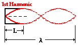 The fundamental frequency is the lowest possible frequency that any instrument can play; it is sometimes referred to as the first harmonic of the instrument. The second harmonic of any instrument always has a frequency that is twice the frequency of the first harmonic. The fourth harmonic of any instrument always has a frequency that is four times the frequency of the first harmonic. As we will see, a strange pattern results for a closed-end air column. Just as for all the instruments, the next harmonic for a closed-end air column is the harmonic that has one more node. And just as for all the instruments, the addition of an extra node also means that an extra antinode must also be added to the pattern. This would result in a total of two vibrational antinodes and one vibrational node. This pattern is shown in the diagram below. Observe in the pattern that there is three-fourths of a full wave in the length of the air column. That is three times the number of waves in the first harmonic. Since, the frequency of this harmonic is three times the frequency of the first harmonic, this is called the third harmonic.