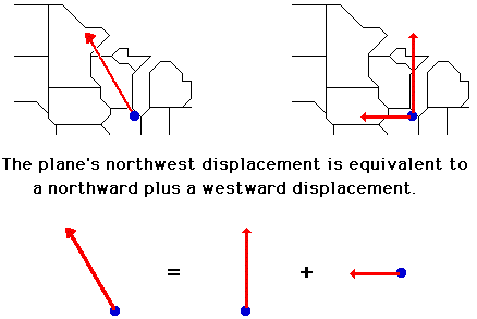 A vector component describes the effect of a vector in a given direction. Any angled vector has two components; one is directed horizontally and the other is directed vertically. For instance, a northwest vector has a northward component and a westward component. Together, the effect these two components are equal to the overall effect of the angled vector. As an example, consider a plane that flies northwest from Chicago O'Hare airport towards the Canada border. The northwest displacement vector of the plane has two components - a northward component and a westward component. When added together, these two components are equal to the overall northwest displacement. This is shown in the diagram below.