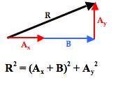 And so the problem of A + B has been transformed into a problem in which all vectors are at right angles to each other. Nasty has been replaced by nice and that should make any physics student happy. With all vectors being at right angles to one another, their addition leads to a resultant that is at the hypotenuse of a right triangle. The Pythagorean theorem can then be used to determine the magnitude of the resultant.