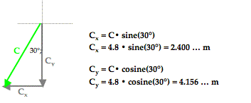 The process of vector resolution was discussed earlier in this lesson. The process involves using the magnitude and the sine and cosine functions to determine the x- and y-components of the vector. Vector C makes a 30° angle with the southern direction. By sketching a right triangle with horizontal and vertical legs and C as the hypotenuse, it becomes possible to determine the components of vector C. This is shown in the diagram below. The side adjacent this 30° angle in the triangle is the vertical side; the vertical side represents the vertical (southward) component of C - Cy. So to determine Cy, the cosine function is used. The side opposite the 30° angle is the horizontal side; the horizontal side represents the horizontal (westward) component of C - Cx. The values of Cx and Cy can be determined by using SOH CAH TOA. The cosine function is used to determine the southward component since the southward component is adjacent to the 30° angle. The sine function is used to determine the westward component since the westward component is the side opposite to the 30° angle. The work is shown below.