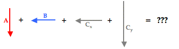 To assist in the discussion, the three vectors have been labeled as vectors A, B, and C. The resultant is the vector sum of these three vectors; a head-to-tail vector addition diagram reveals that the resultant is directed southwest. Of the three vectors being added, vector C is clearly the nasty vector. Its direction is neither due south nor due west. The solution involves resolving this vector into its components.