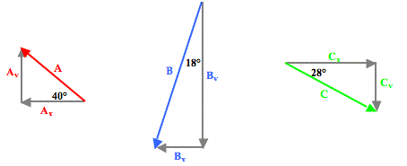To determine the resultant, the three individual vectors are resolved into horizontal and vertical components. The angle information about each vector is used to form a right triangle in which the vector is the hypotenuse and the perpendicular sides are oriented along the east-west and north-south axes. This is shown in the diagram below.
