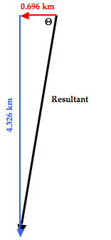 The direction of the resulting displacement can be determined by constructing the final triangle from the components of the resultant. The components of the resultant are simply the sum the east-west and north-south components. Once done, SOH CAH TOA is used to determine the angle that the resultant makes with a nearby axis. The diagram is shown at the right. The angle labeled as theta (Θ) is the angle between the resultant vector and the west axis. This angle can be calculated as follows: