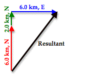 As can be seen in the diagram, the resultant vector (drawn in black) is not the hypotenuse of any right triangle - at least not of any immediately obvious right triangle. But would it be possible to force this resultant vector to be the hypotenuse of a right triangle? The answer is Yes! To do so, the order in which the three vectors are added must be changed. The vectors above were drawn in the order in which they were driven. The student drove north, then east, and then north again. But if the three vectors are added in the order 6.0 km, N + 2.0 km, N + 6.0 km, E, then the diagram will look like this:
