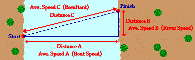 The mathematics of the above problem is no more difficult than dividing or multiplying two numerical quantities by each other. The mathematics is easy! The difficulty of the problem is conceptual in nature; the difficulty lies in deciding which numbers to use in the equations. That decision emerges from one's conceptual understanding (or unfortunately, one's misunderstanding) of the complex motion that is occurring. The motion of the riverboat can be divided into two simultaneous parts - a motion in the direction straight across the river and a motion in the downstream direction. These two parts (or components) of the motion occur simultaneously for the same time duration (which was 20 seconds in the above problem). The decision as to which velocity value or distance value to use in the equation must be consistent with the diagram above. The boat's motor is what carries the boat across the river the Distance A; and so any calculation involving the Distance A must involve the speed value labeled as Speed A (the boat speed relative to the water). Similarly, it is the current of the river that carries the boat downstream for the Distance B; and so any calculation involving the Distance B must involve the speed value labeled as Speed B (the river speed). Together, these two parts (or components) add up to give the resulting motion of the boat. That is, the across-the-river component of displacement adds to the downstream displacement to equal the resulting displacement. And likewise, the boat velocity (across the river) adds to the river velocity (down the river) to equal the resulting velocity. And so any calculation of the Distance C or the Average Speed C ("Resultant Velocity") can be performed using the Pythagorean theorem.
