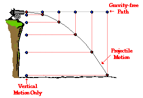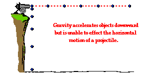 If our thought experiment continues and we project the cannonball horizontally in the presence of gravity, then the cannonball would maintain the same horizontal motion as before - a constant horizontal velocity. Furthermore, the force of gravity will act upon the cannonball to cause the same vertical motion as before - a downward acceleration. The cannonball falls the same amount of distance as it did when it was merely dropped from rest (refer to diagram below). However, the presence of gravity does not affect the horizontal motion of the projectile. The force of gravity acts downward and is unable to alter the horizontal motion. There must be a horizontal force to cause a horizontal acceleration. (And we know that there is only a vertical force acting upon projectiles.) The vertical force acts perpendicular to the horizontal motion and will not affect it since perpendicular components of motion are independent of each other. Thus, the projectile travels with a constant horizontal velocity and a downward vertical acceleration.