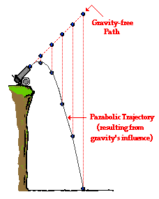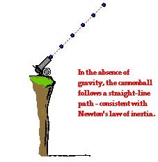 Let's return to our thought experiment from earlier in this lesson. Consider a cannonball projected horizontally by a cannon from the top of a very high cliff. In the absence of gravity, the cannonball would continue its horizontal motion at a constant velocity. This is consistent with the law of inertia. And furthermore, if merely dropped from rest in the presence of gravity, the cannonball would accelerate downward, gaining speed at a rate of 9.8 m/s every second. This is consistent with our conception of free-falling objects accelerating at a rate known as the acceleration of gravity.
