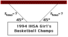 There is an important principle that emanates from some of the trigonometric calculations performed above. The principle is that as the angle with the horizontal increases, the amount of tensional force required to hold the sign at equilibrium decreases. To illustrate this, consider a 10-Newton picture held by three different wire orientations as shown in the diagrams below. In each case, two wires are used to support the picture; each wire must support one-half of the sign's weight (5 N). The angle that the wires make with the horizontal is varied from 60 degrees to 15 degrees. Use this information and the diagram below to determine the tension in the wire for each orientation. When finished, click the button to view the answers.