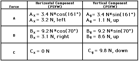 Another way of determining the net force (vector sum of all the forces) involves using the trigonometric functions to resolve each force into its horizontal and vertical components. Once the components are known, they can be compared to see if the vertical forces are balanced and if the horizontal forces are balanced. The diagram below shows vectors A, B, and C and their respective components. For vectors A and B, the vertical components can be determined using the sine of the angle and the horizontal components can be analyzed using the cosine of the angle. The magnitude and direction of each component for the sample data are shown in the table below the diagram.