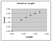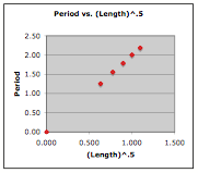 So the conclusion from such an experiment is that the one variable that effects the period of the pendulum is the length of the string. Increases in the length lead to increases in the period. But the investigation doesn't have to stop there. The quantitative equation relating these variables can be determined if the data is plotted and linear regression analysis is performed. The two plots below represent such an analysis. In each plot, values of period (the dependent variable) are placed on the vertical axis. In the plot on the left, the length of the pendulum is placed on the horizontal axis. The shape of the curve indicates some sort of power relationship between period and length. In the plot on the right, the square root of the length of the pendulum (length to the ½ power) is plotted. The results of the regression analysis are shown.