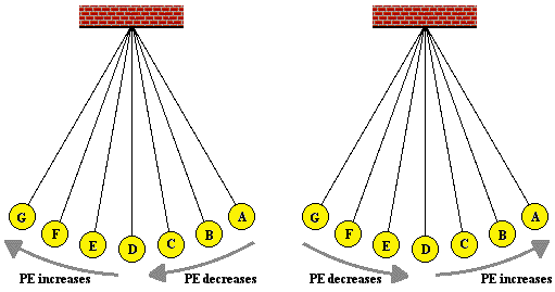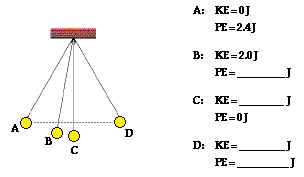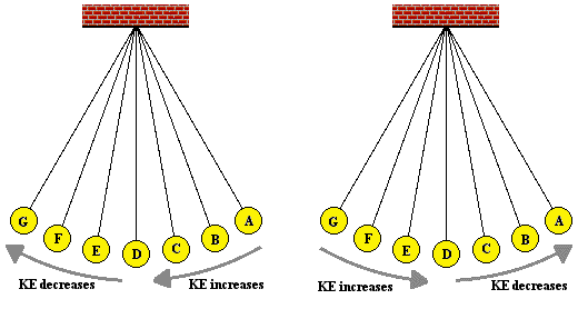 When you inspect the bar charts, it is evident that as the bob moves from A to D, the kinetic energy is increasing and the potential energy is decreasing. However, the total amount of these two forms of energy is remaining constant. Whatever potential energy is lost in going from position A to position D appears as kinetic energy. There is a transformation of potential energy into kinetic energy as the bob moves from position A to position D. Yet the total mechanical energy remains constant. We would say that mechanical energy is conserved. As the bob moves past position D towards position G, the opposite is observed. Kinetic energy decreases as the bob moves rightward and (more importantly) upward toward position G. There is an increase in potential energy to accompany this decrease in kinetic energy. Energy is being transformed from kinetic form into potential form. Yet, as illustrated by the TME bar, the total amount of mechanical energy is conserved. This very principle of energy conservation was explained in the Energy chapter of The Physics Classroom Tutorial.