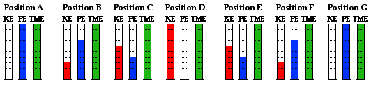 Now let's put these two concepts of kinetic energy and potential energy together as we consider the motion of a pendulum bob moving along the arc shown in the diagram at the right. We will use an energy bar chart to represent the changes in the two forms of energy. The amount of each form of energy is represented by a bar. The height of the bar is proportional to the amount of that form of energy. In addition to the potential energy (PE) bar and kinetic energy (KE) bar, there is a third bar labeled TME. The TME bar represents the total amount of mechanical energy possessed by the pendulum bob. The total mechanical energy is simply the sum of the two forms of energy – kinetic plus potential energy. Take some time to inspect the bar charts shown below for positions A, B, D, F and G. What do you notice?