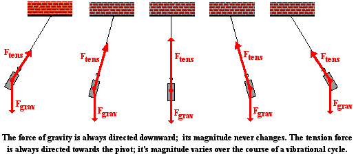 Earlier in this lesson we learned that an object that is vibrating is acted upon by a restoring force. The restoring force causes the vibrating object to slow down as it moves away from the equilibrium position and to speed up as it approaches the equilibrium position. It is this restoring force that is responsible for the vibration. So what forces act upon a pendulum bob? And what is the restoring force for a pendulum? There are two dominant forces acting upon a pendulum bob at all times during the course of its motion. There is the force of gravity that acts downward upon the bob. It results from the Earth's mass attracting the mass of the bob. And there is a tension force acting upward and towards the pivot point of the pendulum. The tension force results from the string pulling upon the bob of the pendulum. In our discussion, we will ignore the influence of air resistance - a third force that always opposes the motion of the bob as it swings to and fro. The air resistance force is relatively weak compared to the two dominant forces.