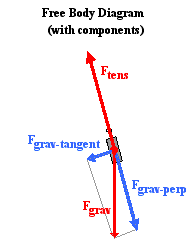 In physical situations in which the forces acting on an object are not in the same, opposite or perpendicular directions, it is customary to resolve one or more of the forces into components. This was the practice used in the analysis of sign hanging problems and inclined plane problems. Typically one or more of the forces are resolved into perpendicular components that lie along coordinate axes that are directed in the direction of the acceleration or perpendicular to it. So in the case of a pendulum, it is the gravity force which gets resolved since the tension force is already directed perpendicular to the motion. The diagram at the right shows the pendulum bob at a position to the right of its equilibrium position and midway to the point of maximum displacement. A coordinate axis system is sketched on the diagram and the force of gravity is resolved into two components that lie along these axes. One of the components is directed tangent to the circular arc along which the pendulum bob moves; this component is labeled Fgrav-tangent. The other component is directed perpendicular to the arc; it is labeled Fgrav-perp. You will notice that the perpendicular component of gravity is in the opposite direction of the tension force. You might also notice that the tension force is slightly larger than this component of gravity. The fact that the tension force (Ftens) is greater than the perpendicular component of gravity (Fgrav-perp) means there will be a net force which is perpendicular to the arc of the bob's motion. This must be the case since we expect that objects that move along circular paths will experience an inward or centripetal force. The tangential component of gravity (Fgrav-tangent) is unbalanced by any other force. So there is a net force directed along the other coordinate axes. It is this tangential component of gravity which acts as the restoring force. As the pendulum bob moves to the right of the equilibrium position, this force component is directed opposite its motion back towards the equilibrium position.