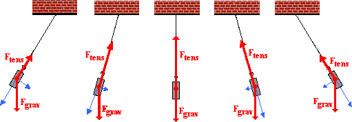 The above analysis applies for a single location along the pendulum's arc. At the other locations along the arc, the strength of the tension force will vary. Yet the process of resolving gravity into two components along axes that are perpendicular and tangent to the arc remains the same. The diagram below shows the results of the force analysis for several other positions.