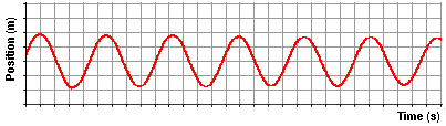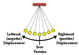 In the previous part of this lesson, we investigated the sinusoidal nature of the motion of a mass on a spring. We will conduct a similar investigation here for the motion of a pendulum bob. Let's suppose that we could measure the amount that the pendulum bob is displaced to the left or to the right of its equilibrium or rest position over the course of time. A displacement to the right of the equilibrium position would be regarded as a positive displacement; and a displacement to the left would be regarded as a negative displacement. Using this reference frame, the equilibrium position would be regarded as the zero position. And suppose that we constructed a plot showing the variation in position with respect to time. The resulting position vs. time plot is shown below. Similar to what was observed for the mass on a spring, the position of the pendulum bob (measured along the arc relative to its rest position) is a function of the sine of the time.