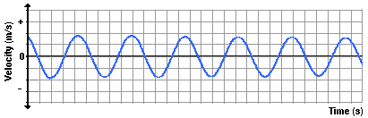 Now suppose that we use our motion detector to investigate the how the velocity of the pendulum changes with respect to the time. As the pendulum bob does the back and forth, the velocity is continuously changing. There will be times at which the velocity is a negative value (for moving leftward) and other times at which it will be a positive value (for moving rightward). And of course there will be moments in time at which the velocity is 0 m/s. If the variations in velocity over the course of time were plotted, the resulting graph would resemble the one shown below.