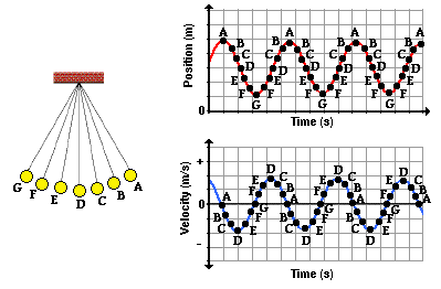 As is often said, a picture is worth a thousand words. Now here come the words. The plot above is based upon the equilibrium position (D) being designated as the zero position. A displacement to the left of the equilibrium position is regarded as a negative position. A displacement to the right is regarded as a positive position. An analysis of the plots shows that the velocity is least when the displacement is greatest. And the velocity is greatest when the displacement of the bob is least. The further the bob has moved away from the equilibrium position, the slower it moves; and the closer the bob is to the equilibrium position, the faster it moves. This can be explained by the fact that as the bob moves away from the equilibrium position, there is a restoring force that opposes its motion. This force slows the bob down. So as the bob moves leftward from position D to E to F to G, the force and acceleration is directed rightward and the velocity decreases as it moves along the arc from D to G. At G - the maximum displacement to the left - the pendulum bob has a velocity of 0 m/s. You might think of the bob as being momentarily paused and ready to change its direction. Next the bob moves rightward along the arc from G to F to E to D. As it does, the restoring force is directed to the right in the same direction as the bob is moving. This force will accelerate the bob, giving it a maximum speed at position D - the equilibrium position. As the bob moves past position D, it is moving rightward alo