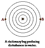legs in order to produce disturbances that travel through the water. If these disturbances originate at a point, then they would travel outward from that point in all directions. Since each disturbance is traveling in the same medium, they would all travel in every direction at the same speed. The pattern produced by the bug's shaking would be a series of concentric circles as shown in the diagram at the right. These circles would reach the edges of the water puddle at the same frequency. An observer at point A (the left edge of the puddle) would observe the disturbances to strike the puddle's edge at the same frequency that would be observed by an observer at point B (at the right edge of the puddle). In fact, the frequency at which disturbances reach the edge of the puddle would be the same as the frequency at which the bug produces the disturbances. If the bug produces disturbances at a frequency of 2 per second, then each observer would observe them approaching at a frequency of 2 per second.