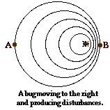 the same frequency of 2 disturbances per second. Since the bug is moving towards the right, each consecutive disturbance originates from a position that is closer to observer B and farther from observer A. Subsequently, each consecutive disturbance has a shorter distance to travel before reaching observer B and thus takes less time to reach observer B. Thus, observer B observes that the frequency of arrival of the disturbances is higher than the frequency at which disturbances are produced. On the other hand, each consecutive disturbance has a further distance to travel before reaching observer A. For this reason, observer A observes a frequency of arrival that is less than the frequency at which the disturbances are produced. The net effect of the motion of the bug (the source of waves) is that the observer towards whom the bug is moving observes a frequency that is higher than 2 disturbances/second; and the observer away from whom the bug is moving observes a frequency that is less than 2 disturbances/second. This effect is known as the Doppler effect.