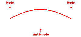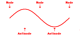 As discussed earlier in Lesson 4, the production of standing wave patterns demand that the introduction of crests and troughs into the medium be precisely timed. If the timing is not precise, then a regular and repeating wave pattern will not be discerned within the medium - a harmonic does not exist at such a frequency. With precise timing, reflected vibrations from the opposite end of the medium will interfere with vibrations introduced into the medium in such a manner that there are points that always appear to be standing still. These points of no displacement are referred to as nodes. Positioned in between every node is a point that undergoes maximum displacement from a positive position to a negative position. These points of maximum displacement are referred to as antinodes.