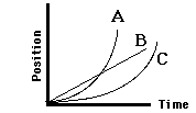 3. Consider the position-time graph at the right. Each one of the three lines on the position-time graph corresponds to the motion of one of the three cars. Match the appropriate line to the particular color of car.