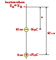 The location of 0 electric field is a distance of x cm from the -16 µC charge and a distance of 62+x cm from the +25µC charge. These distances and charge values can be inserted into the equation above and algebra can be used to solve for x. (Note that the + and - sign has been dropped from the equations; directional meaning has been accounted for in the reasoning above.)