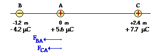 Now the net electric force on object A can be determined by adding the two forces resulting from the interactions with A and with B. The net force is 0.21 N, left. (0.214 N rounded to two significant digits)