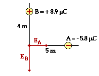 EB = kQB/RB2 = (9.0x109 N/m2/C2)•(8.9x10-6 C)/(4.0 m)2 = 5.006 x 103 N/C