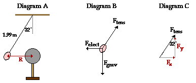 Diagram B above shows a free-body diagram for the balloon. The three forces must balance since the balloon is at rest. Therefore, the x-component of the tension force (Fx in Diagram C) must equal the electrical force (Felect). And similarly, the y-component of the tension force (Fy in Diagram C) must equal the gravity force (Fgrav). A trigonometric function relating the angle of 32.0 degrees to these components of forces can be written.