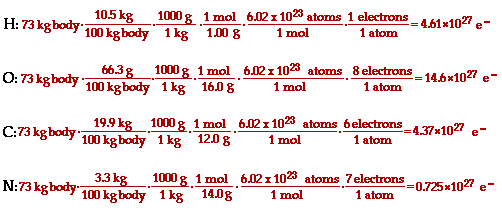 - Use these percentages, the molar mass values, Avogadro's number, and the atomic numbers to determine the total number of electrons (and protons) in a 73-kg human body (160 pounds).