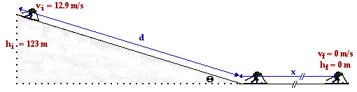 These forces act upon the skier over different distances. In the case of the inclined plane, the distance (d) can be computed from the given incline angle and the initial height. The relationship is depicted in the diagram below. The sine function is used to relate the angle to the initial height and the distance along the incline. In the case of the level surface, the distance is the unknown quantity (x) which this problem calls for.