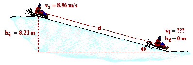 This problem is similar to the above. During the entire descent down the hill, gravity is doing work on the sledder and friction is doing negative work on the sledder. Friction is a non-conservative force and will alter the total mechanical energy of the sledder. The equation to be used is