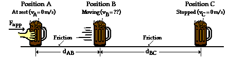 Here is an instance in which there is only horizontal motion and a non-conservative force is doing work to change the kinetic energy of the mug. The entire motion will have to be divided into two parts - the part in which both friction and applied force act upon the mug (Pete is pushing it from position A to position B) and the part in which the mug is slowing down under the sole influence of friction (from position B to position C). The work-energy theorem (W = Delta KE) will be used to analyze each part.