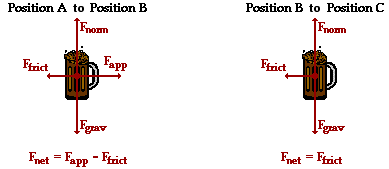 From position A to position B, Pete is pushing the mug and the net force upon the mug is simply the applied force minus the friction force (see free-body diagram below). From position B to position C, friction is the unbalanced force and acts as the net force (see free-body diagram below).
