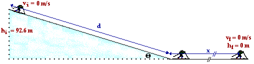 If we designate the level area at the bottom of the slope as the zero level of potential energy, then PEf is 0 J. Since Suzie eventually stops (due to the effect of friction along the level area), the KEf is 0 J. And since Suzie starts from rest, KEi = 0 J. So the above equation becomes
